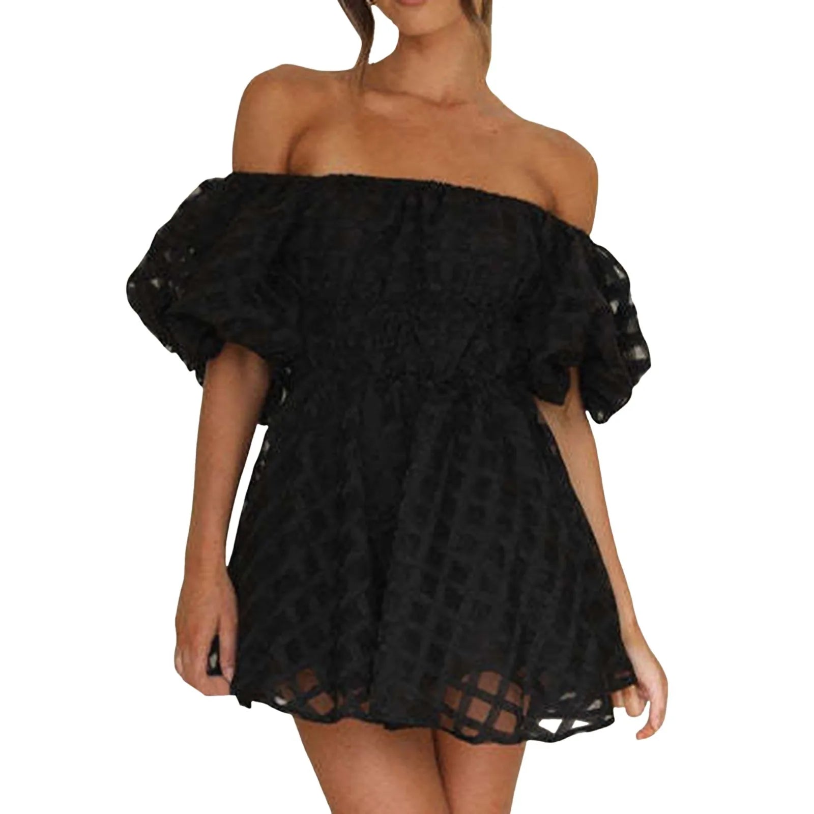 Damen Minikleid mit schulterfreiem Design und elastischem Ausschnitt. Puffärmel mit elastischen Bündchen für eine bequeme Passform. Gerader Schnitt geeignet für verschiedene Anlässe. Geeignet für den täglichen Gebrauch und festliche Veranstaltungen.