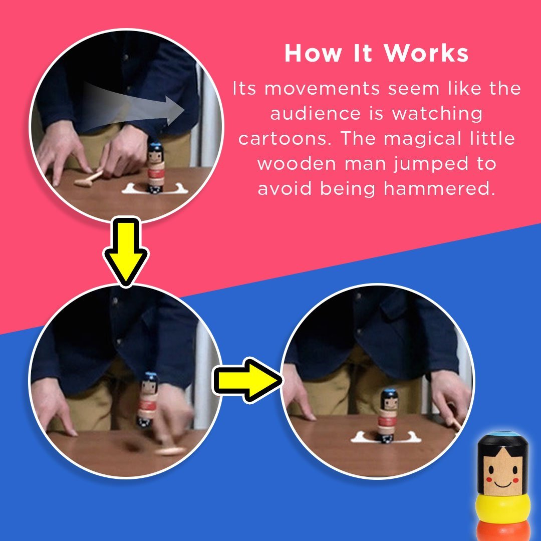 So funktioniert’s: Mit Hammer umklopfen, dann zieht der unsichtbare Faden – und der Holzmann steht wieder auf! Für die perfekte Illusion: 1,5 m Abstand halten & dunkle Kleidung tragen.